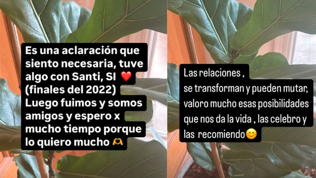 Con una foto de un rincón de su casa como fondo, la expareja de Marcelo Tinelli escribió en la primera publicación: “Es una aclaración que siento necesaria, tuve algo con Santi, sí. (A finales del 2022). Luego fuimos y somos amigos y espero por mucho tiempo porque lo quiero mucho”, y cerró con un emoji de manitos formando un corazón.