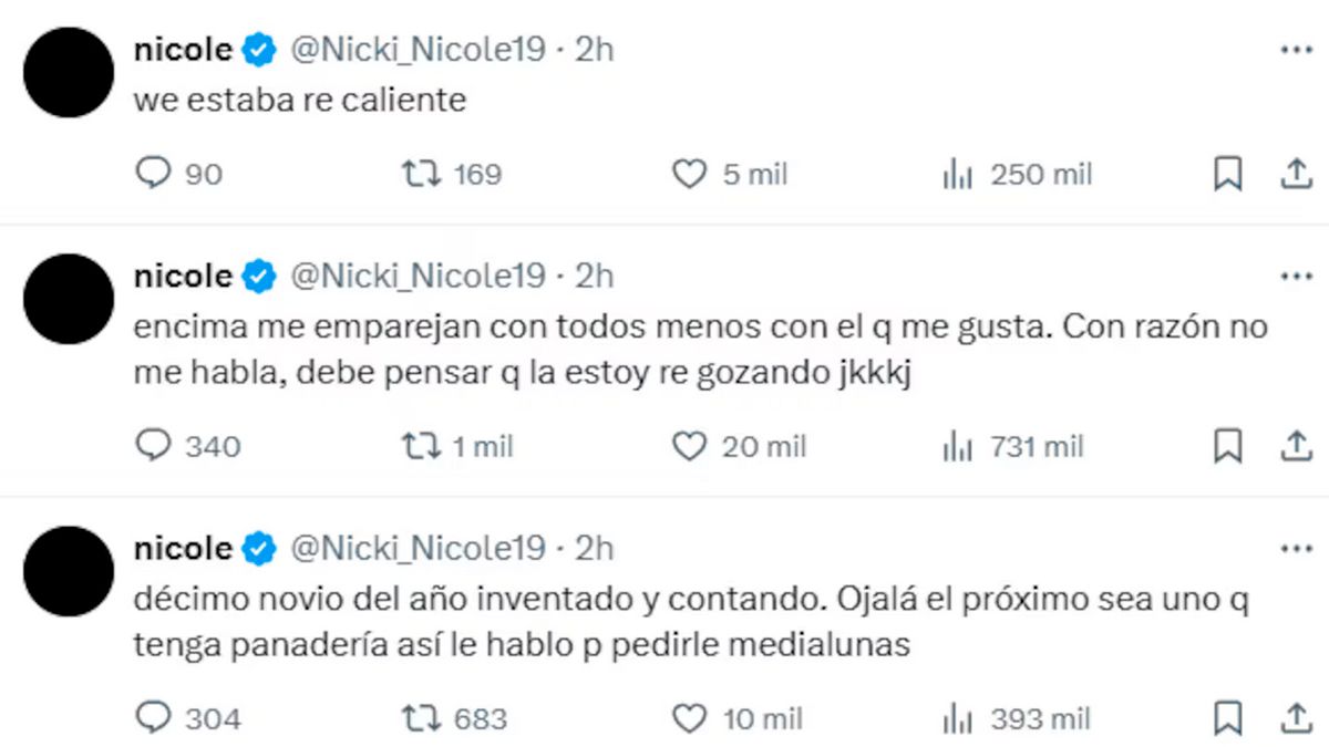 Cansada, la rosarina se despachó en su cuenta X (Ex Twitter): “Décimo novio del año inventado y contando. Ojalá el próximo sea uno que tenga panadería, así le hablo para pedirle medialunas”.