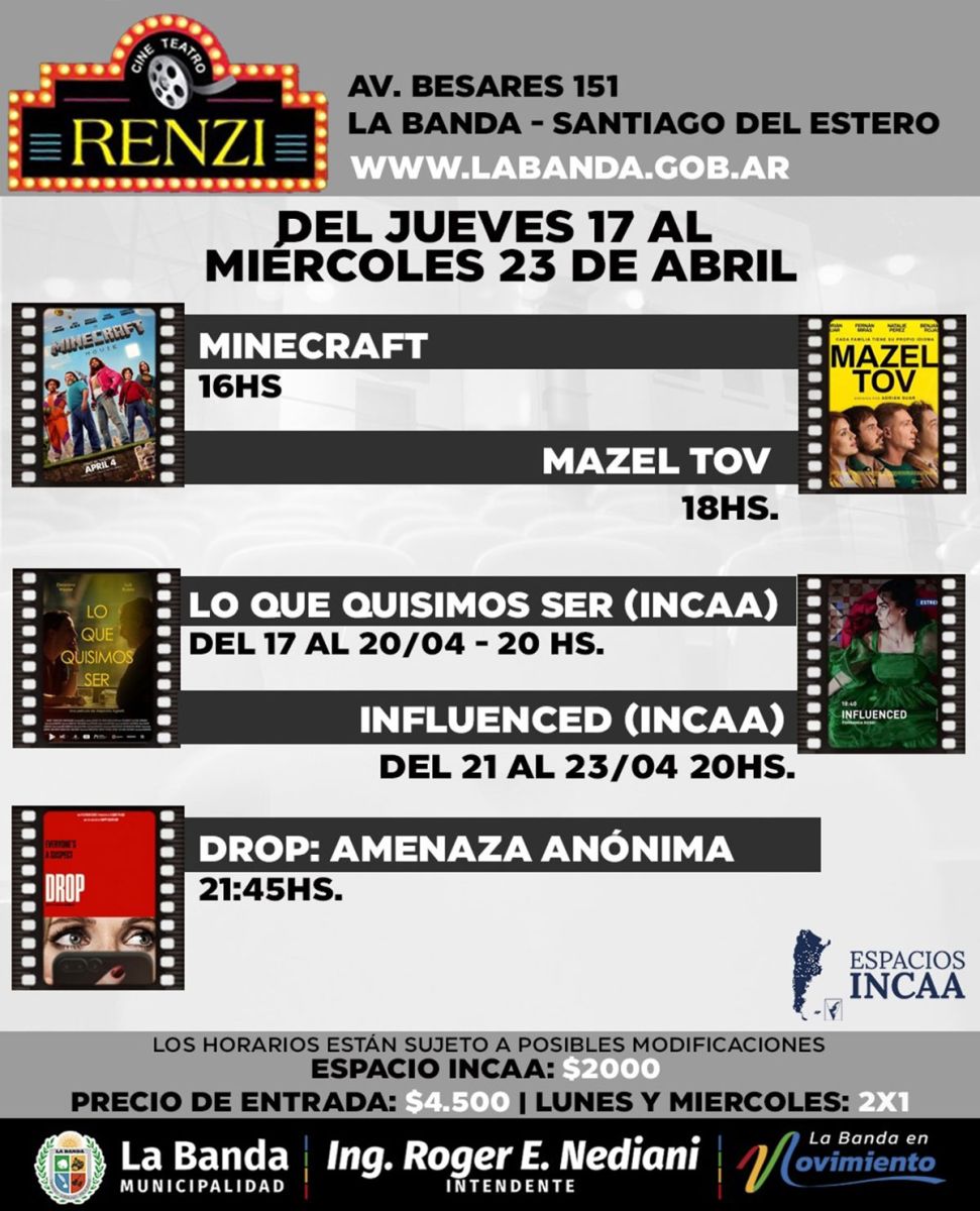 El Cine Teatro Renzi renueva su oferta cinematográfica y desde este fin de semana largo de pascuas y hasta el próximo miércoles 22 de abril, se proyectarán las películas “Una película de Minecraft”, “Mazel Tov”, “Lo que quisimos ser”, “Influenced” y “Drop: amenaza anónima”.