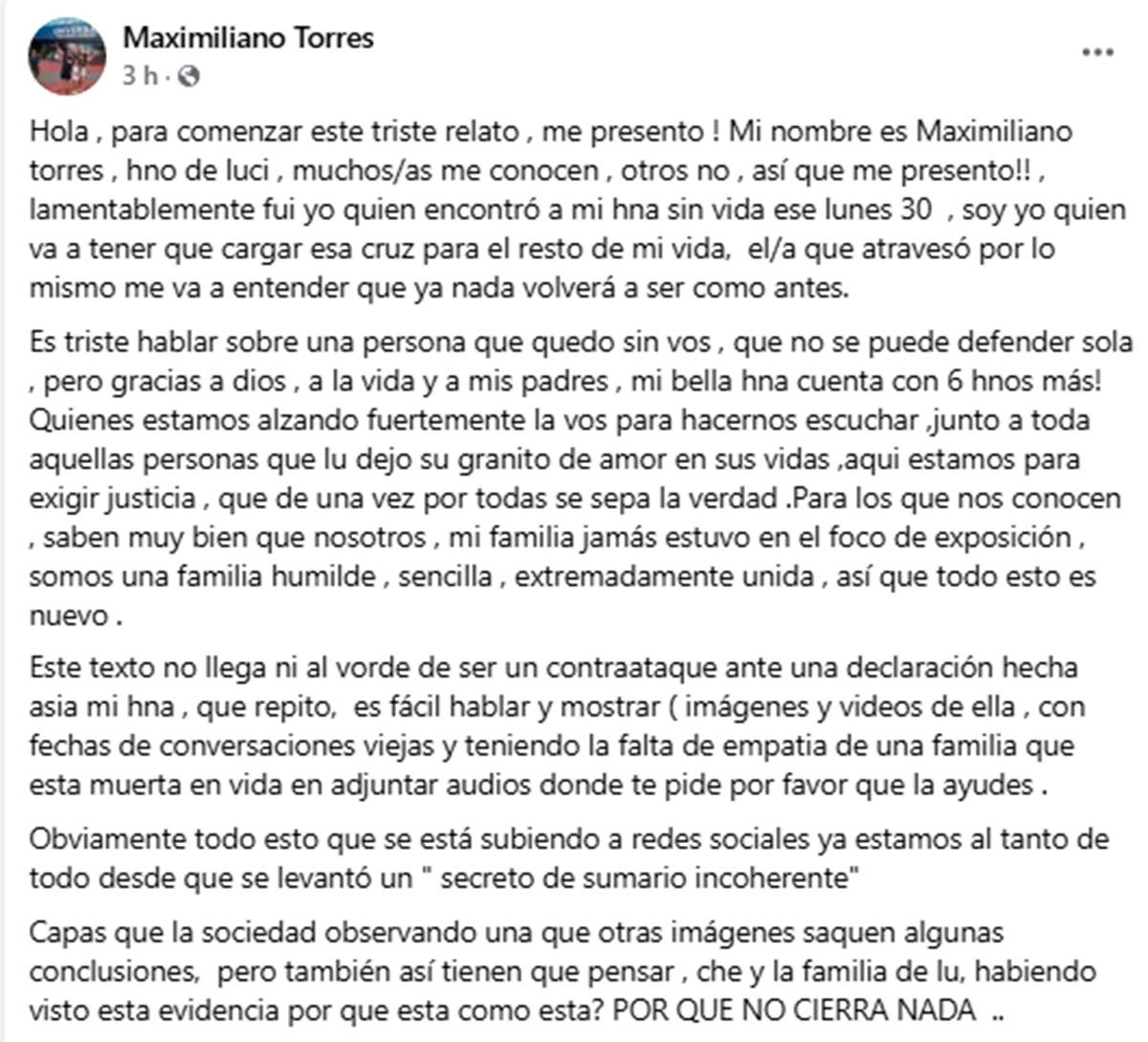 “Soy yo quien encontró a mi hermana sin vida ese lunes 30, y soy yo quien va a tener que cargar esa cruz para el resto de mi vida”, comenzó diciendo Maximiliano en un texto cargado de dolor, donde además agradeció el apoyo a la familia.