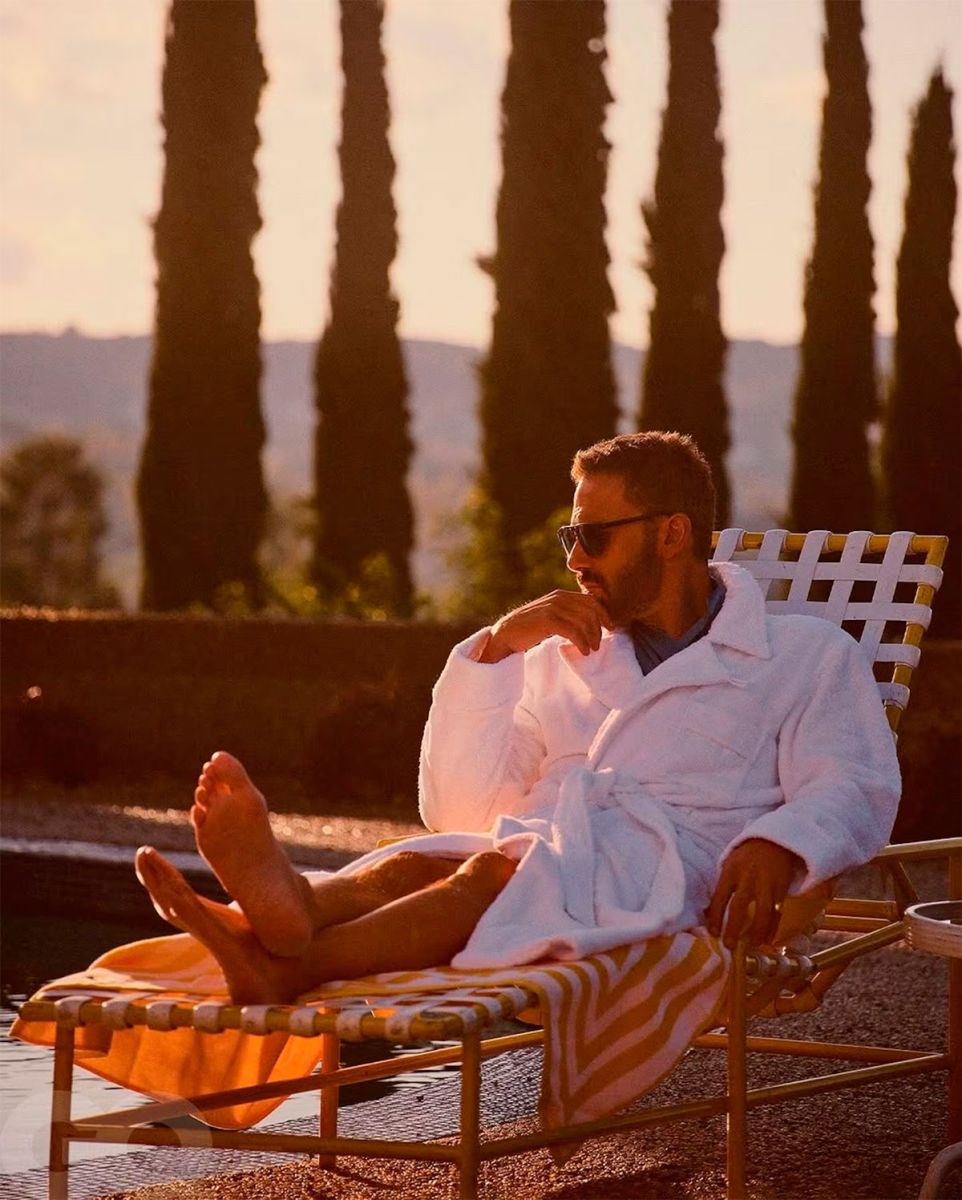 Por último, más informal, pero con la elegancia que lo caracteriza, posó al aire libre junto a una elegante pileta sobre una silla de playa con una bata de toalla blanca y, una vez más, lentes de sol oscuros.