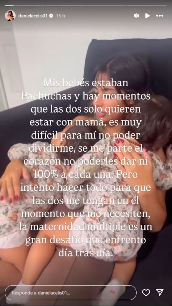 La confesión no termina ahí. En una segunda publicación, Daniela muestra los termómetros. Tres cifras que paralizan: 39,5°, 38,9°, 39,4°. La fiebre se repite, las noches se vuelven eternas, los brazos no alcanzan. Y la angustia, aunque silenciada, tiembla detrás de cada gesto. “Fueron días complicados, de mucha contención, mucho amor, días en que solo sentía miedo y tristeza, pero tenía que ser fuerte para ellas”, escribió.