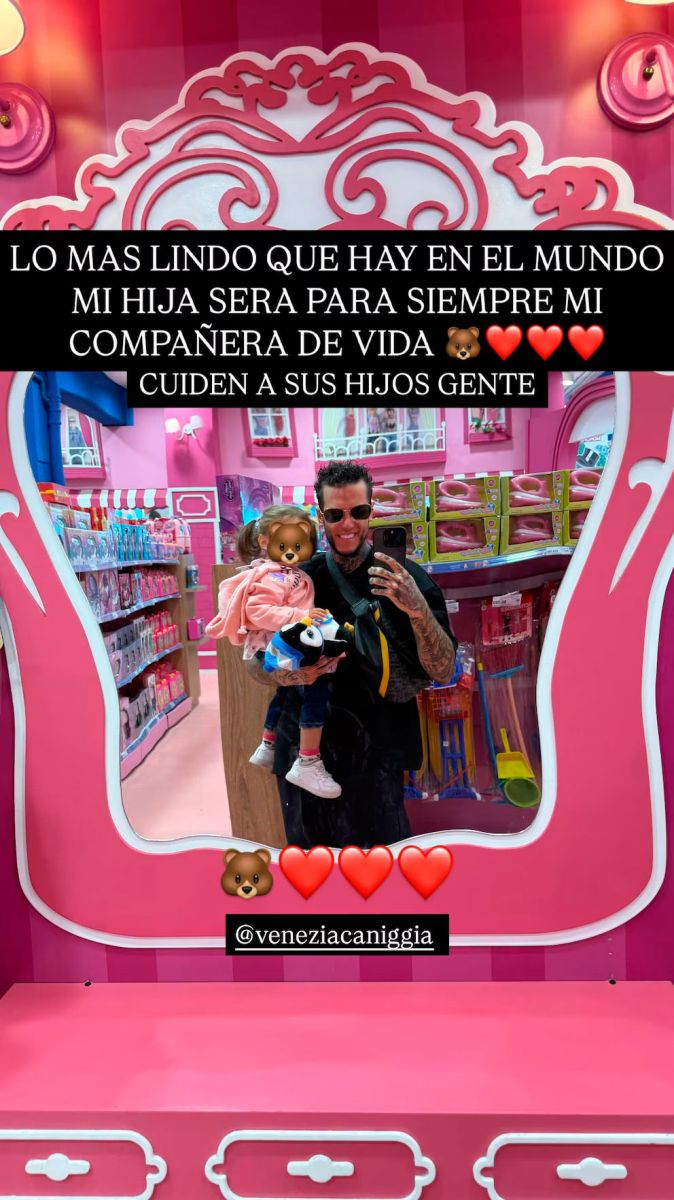 Luego el ganador de El Hotel de los Famosos mostró a su hija en una juguetería. “Con el amor de mi vida”, escribió, junto a una selfie sonriendo, mientras a su nena le cubrió la cara, para preservar su identidad, con el emoji de un oso. “Todo para la osa. Soy el mejor padre del mundo. Corta la boca”, lanzó, mientras filmaba un pasillo todo pintado de rosa con todo tipo de muñecas.