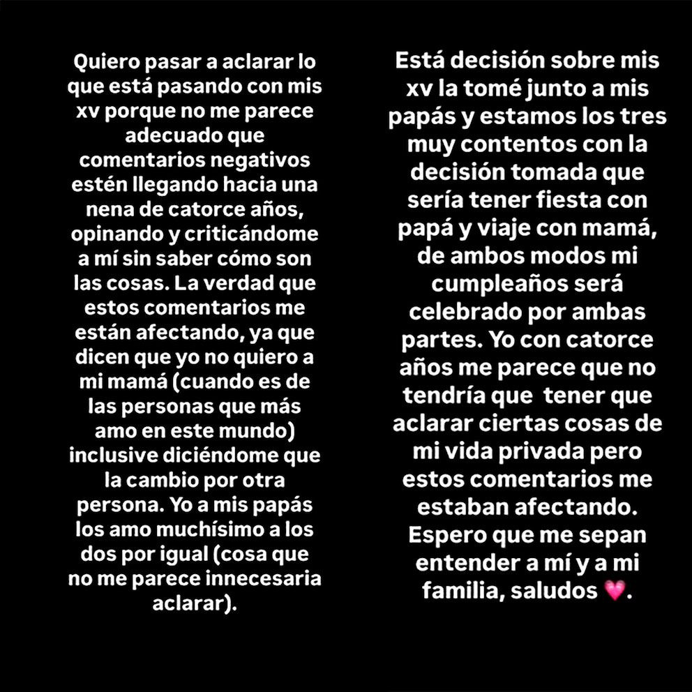 Por su parte, la adolescente dejó en claro que su deseo es simple: poder disfrutar su cumpleaños sin que su vida personal sea cuestionada. “Yo a mis papás los amo muchísimo, a los dos por igual (cosa que no me parece necesaria aclarar)”, escribió en su posteo. Pero lo aclaró, porque muchos decidieron opinar sin conocer la historia completa.