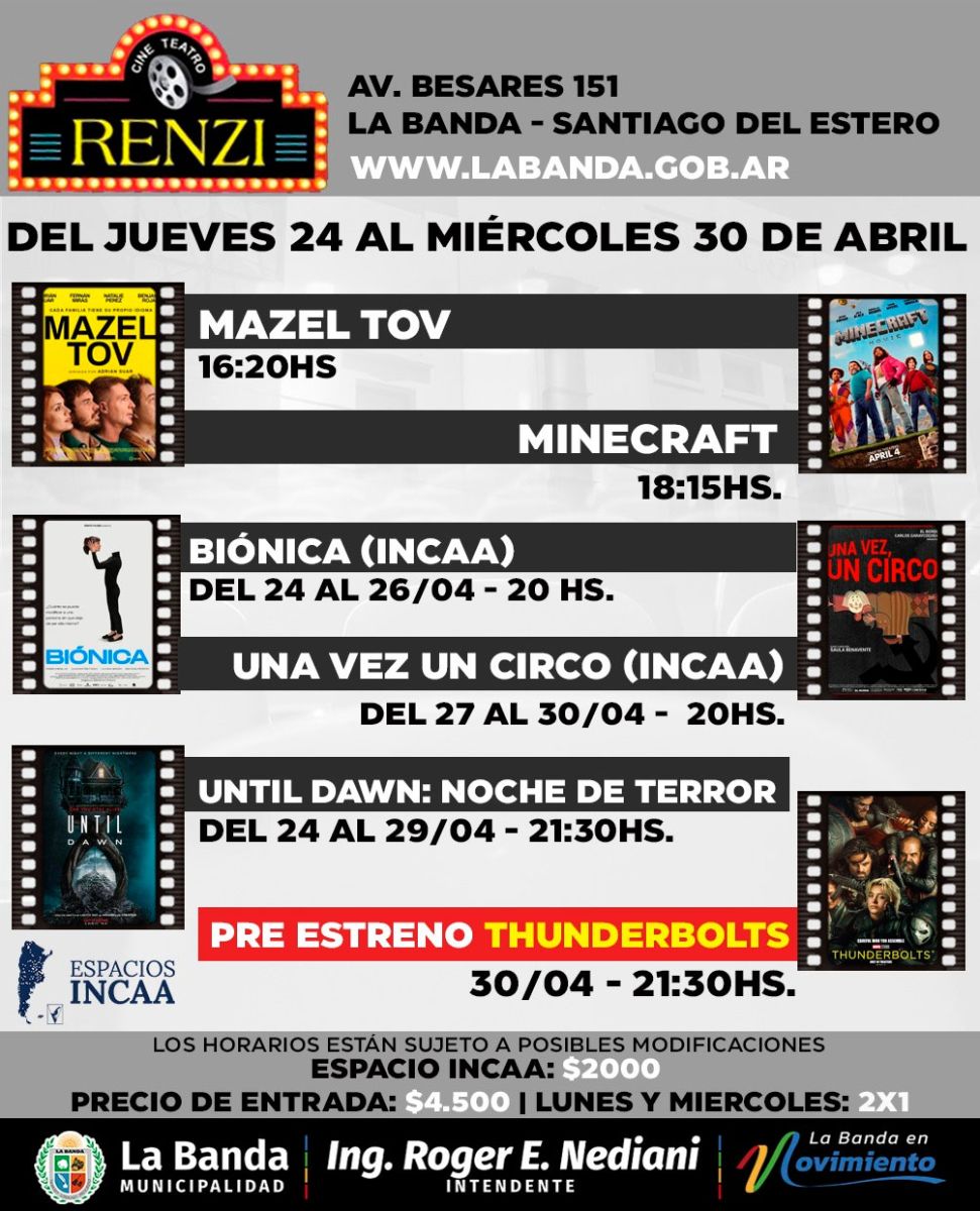La Municipalidad de La Banda informa que el Cine Teatro Renzi presenta una nueva programación con una variada propuesta cinematográfica para todos los gustos, desde el miércoles 24 hasta el martes 29 de abril.