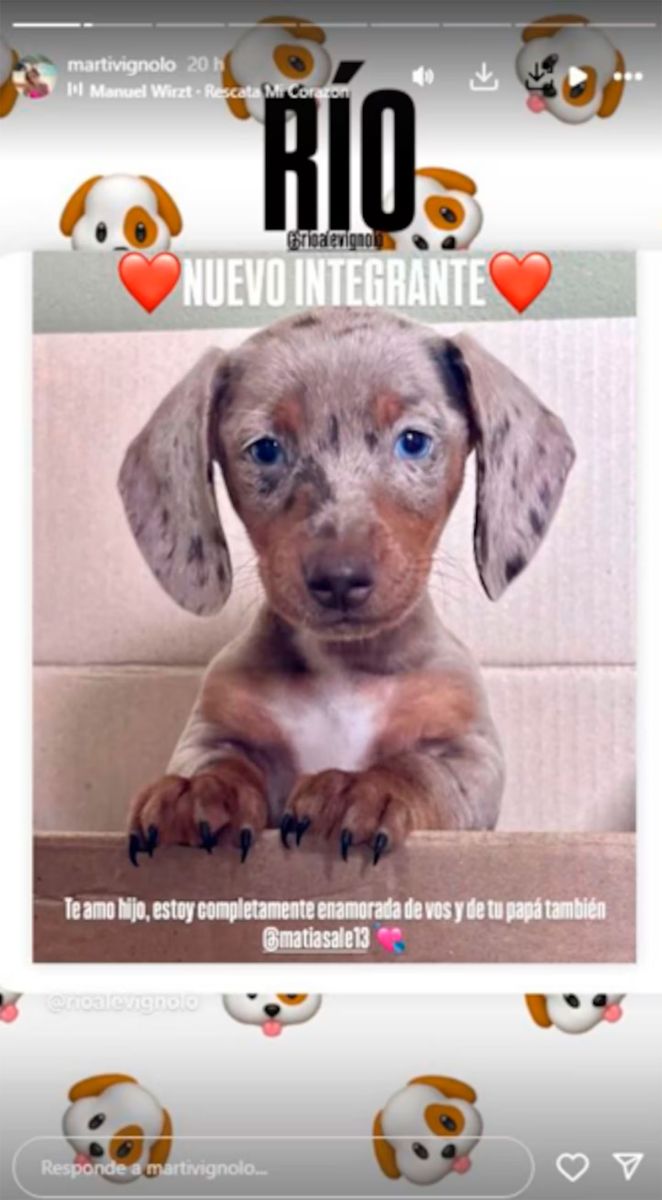 “Río. Nuevo integrante. Te amo hijo, estoy completamente enamorada de vos y de tu papá también”, escribió la novia del actor junto a una foto de un cachorro.