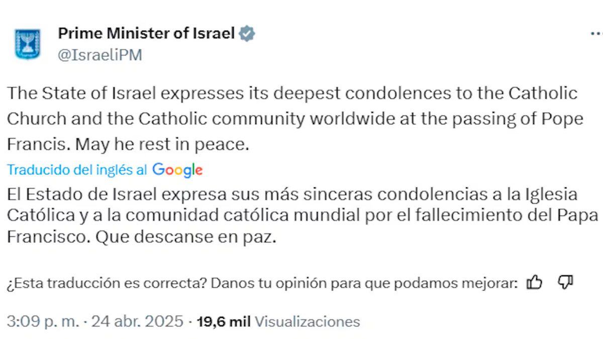 "El Estado de Israel expresa sus más sinceras condolencias a la Iglesia Católica y a la comunidad católica mundial por el fallecimiento del papa Francisco. Que descanse en paz", posteó la cuenta de la oficina en X.