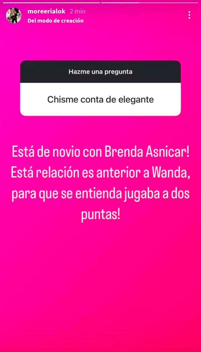 Como Morena se debe a sus fanáticos, no dudó en asegurar: “Está de novio con Brenda Asnicar”. “Esta relación es anterior a Wanda. Para que se entienda, jugaba a dos puntas”, sentenció.