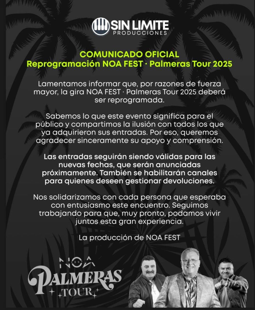 La productora Sin Límite anunció oficialmente la reprogramación de la esperada gira “NOA FEST - Palmeras Tour 2025”.
