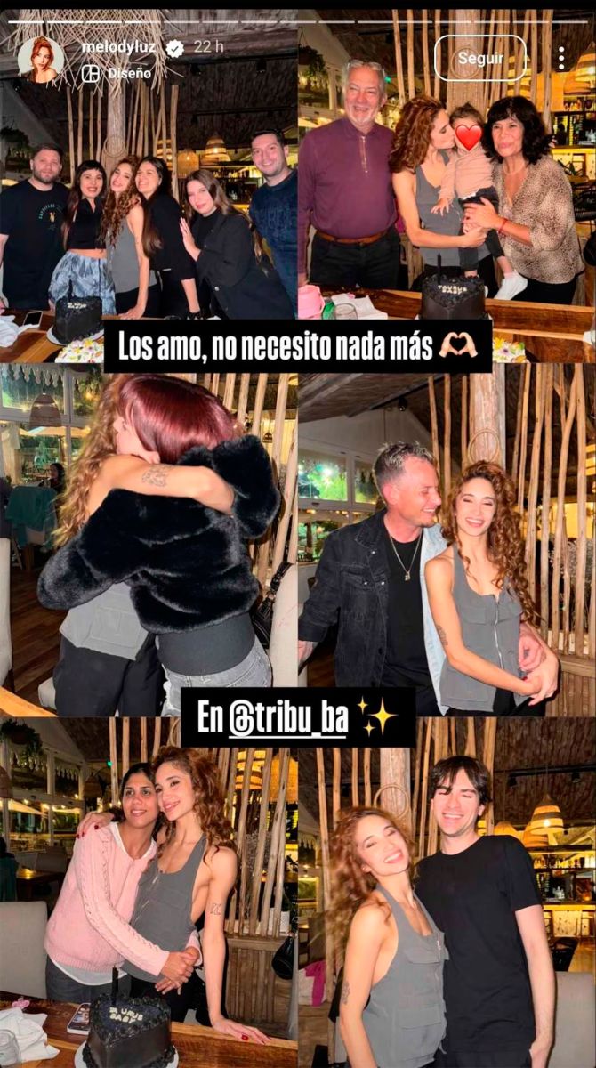 A través de Instagram, la bailarina compartió varias historias donde se la podía ver disfrutando de su cumpleaños junto a su hija Venezia, amigos, familiares y su actual pareja, Santiago del Azar. En una de las publicaciones, Melody dejó en claro que ya superó su relación con Caniggia: “Los amo, no necesito nada más”, escribió, expresando felicidad por estar rodeada de quienes más quiere.