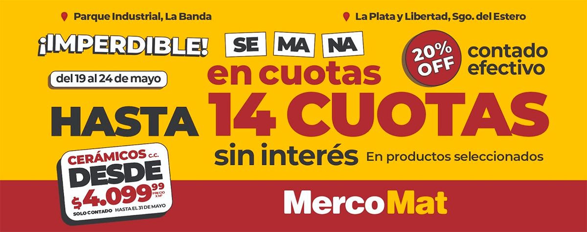Del 19 al 24 de mayo pagá en hasta 14 cuotas sin interés en productos seleccionados, obtené 20% de descuento en efectivo y cerámicos desde $4.099.