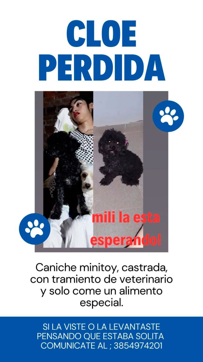 Cloe es una caniche mini toy negra, castrada y bajo tratamiento veterinario. Se perdió en la zona del negocio Marckt Romi y necesita alimentación especial.