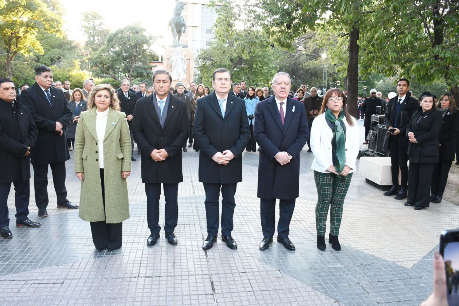 Neder y el jefe de Gabinete de Ministros, Elías Suárez en el izamiento de la enseña nacional y luego junto a funcionarios del gabinete municipal realizó la colocación de ofrendas florales al pie del monumento al Gral. Belgrano.