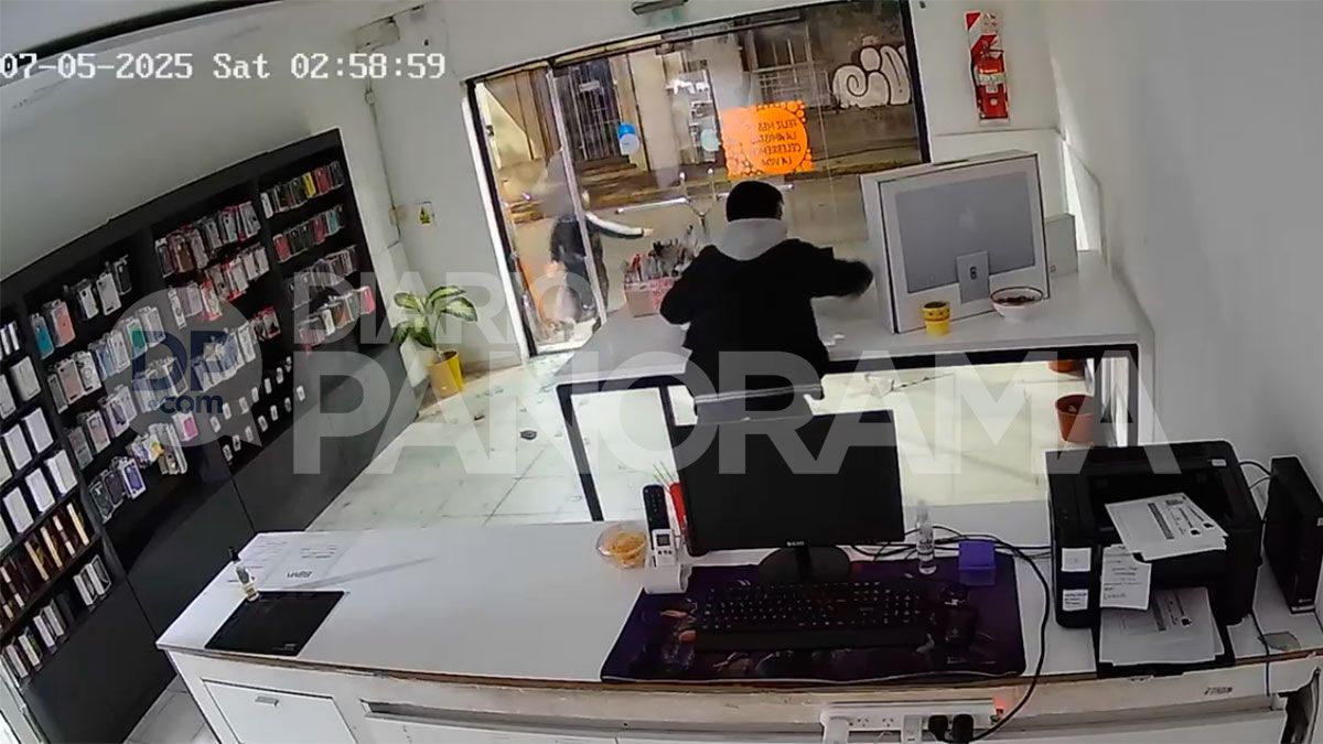 El hecho ocurrió alrededor de las 3 de la mañana y todo quedó registrado en las cámaras de seguridad del comercio. Según se observa, uno de los delincuentes arrojó lo que parece ser una piedra para romper el vidrio, lo que provocó que de inmediato se activara la alarma del lugar.