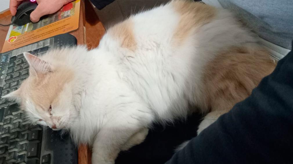 Es de pelaje blanco con manchas marrones y está castrada. Tiene un comportamiento tranquilo y cariñoso.