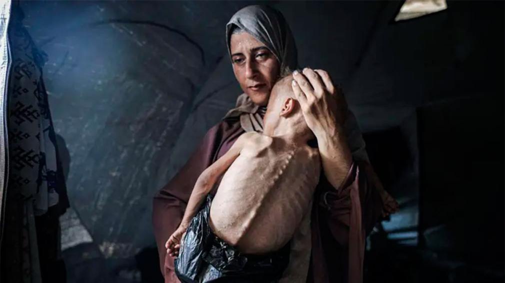 El pequeño fue retratado junto a su madre por el fotógrafo Ahmed al-Arini el 21 de julio en una tienda de campaña levantada en la Franja, donde escasean los elementos más básicos para la subsistencia de los gazatíes.