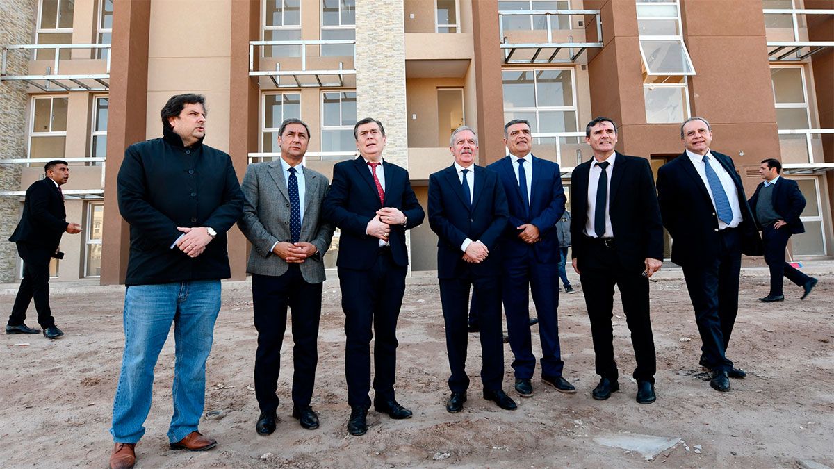 Junto con el ministro de Obras Públicas, Aldo Hid, y el presidente del Instituto Provincial de Vivienda y Urbanismo, Augusto Du Bois, también fue visitado un complejo donde están en marcha los trabajos para otras 570 viviendas tipo departamento y la nueva terminal de ómnibus diseñada para la creciente demanda del principal centro turístico de la provincia.