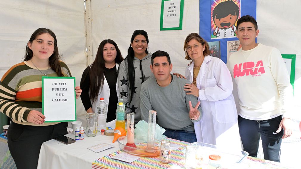 Docentes del stand de Comunicación y Desarrollo Territorial propusieron actividades con materiales caseros para despertar vocaciones científicas y remarcaron la defensa de la investigación nacional.