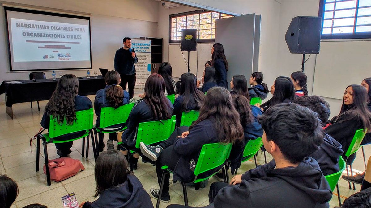 En el marco de Feria del Libro Municipal se desarrolló la charla "Narrativas digitales para organizaciones civiles" a cargo del licenciado Facundo Rivero de la localidad de Paraná donde estuvieron presentes alumnos del nivel secundario del Colegio "Miguel Ángel" de la ciudad de La Banda.