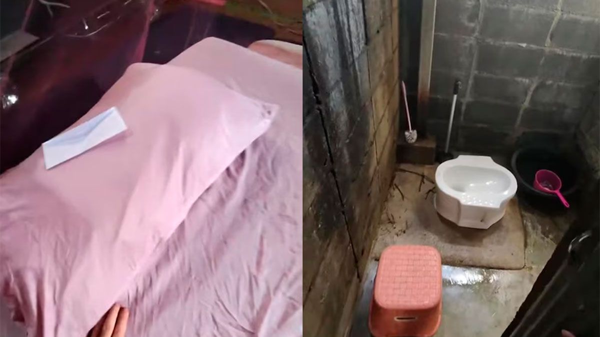La habitación ofrecida era minimalista: solo contaba con lo básico, como una mosquitera, un ventilador y un suelo lleno de agujeros, los cuales estaban cubiertos con cinta adhesiva de color rosa. Barrueco no dudó en comentar con ironía sobre las condiciones de la habitación: