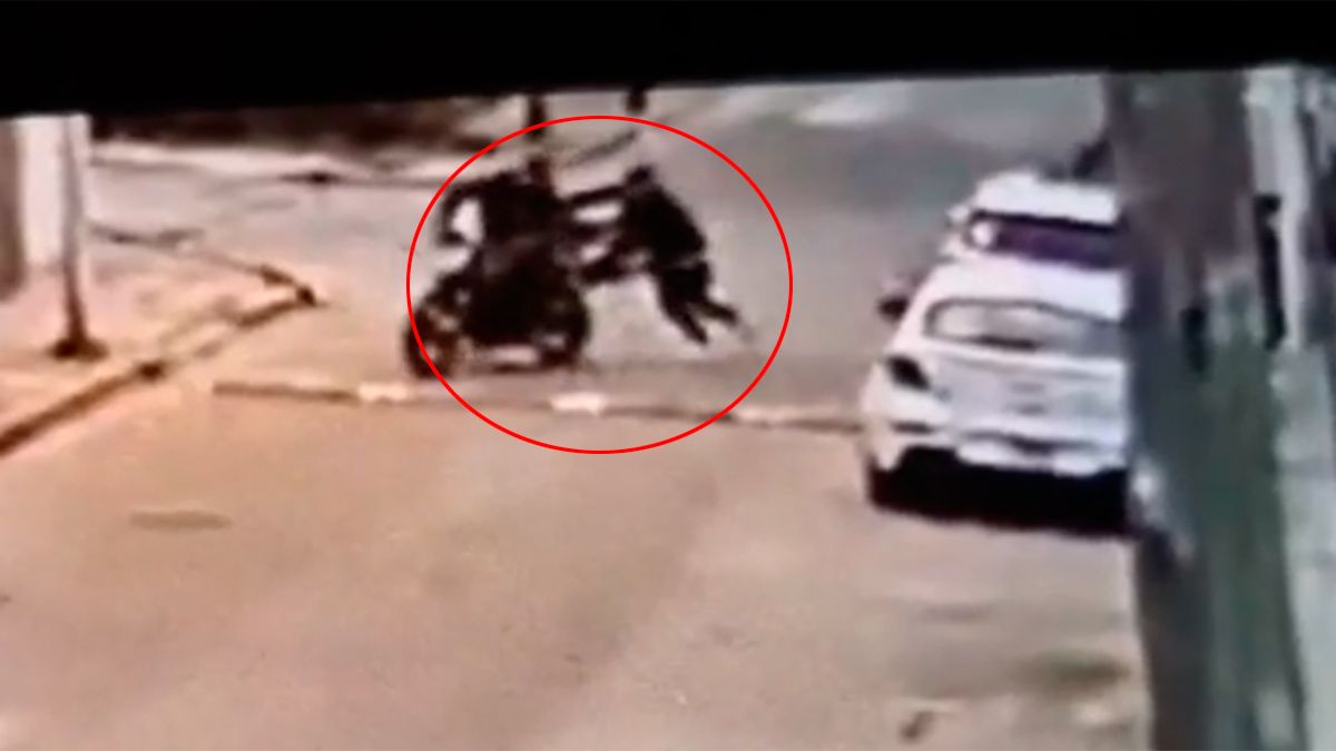 Al alertar el robo, el motociclista se fue corriendo, los delincuentes efectuaron disparos al aire y se dividieron; dos se fueron en el auto y otros dos quedaron en el lugar junto a la moto. Al intentar llevársela, uno de ellos se desplomó en medio de la calle, mientras que el otro escapó en la moto robada.