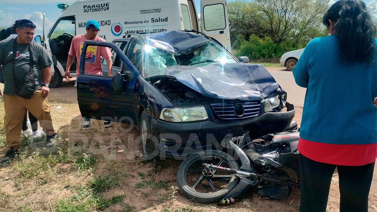 Un violento choque entre un automóvil y un motovehículo se produjo alrededor de las 15.30 horas, de este jueves, en la Ruta 92, a la altura del barrio Campo Rosso, a unos 3 km del ingreso a la ciudad de Añatuya.