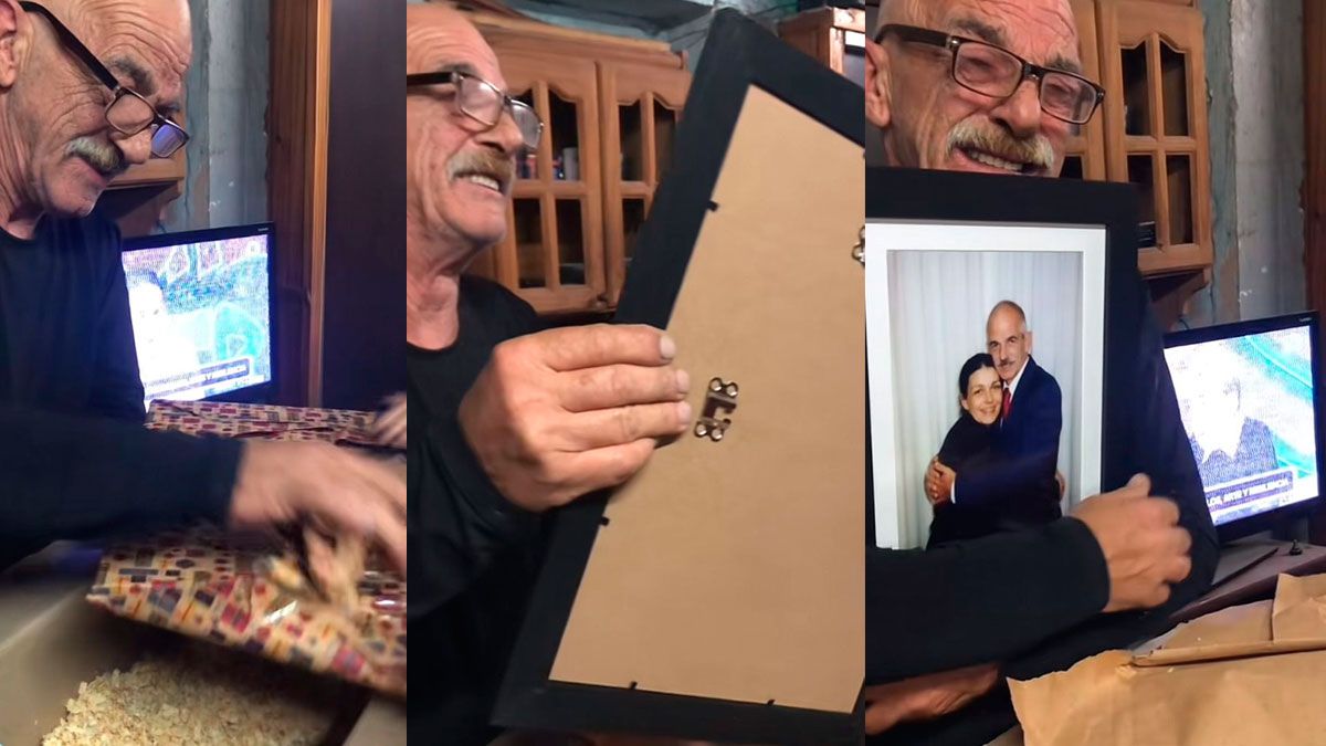 Al sacar el envoltorio, encontró una foto y se quedó en silencio unos segundos. Al reconocer la imagen, no pudo contener las lágrimas. Se trataba de un retrato hecho con inteligencia artificial que lo mostraba junto a su difunta esposa. Conmovido, lo besó y lo sostuvo contra su pecho.