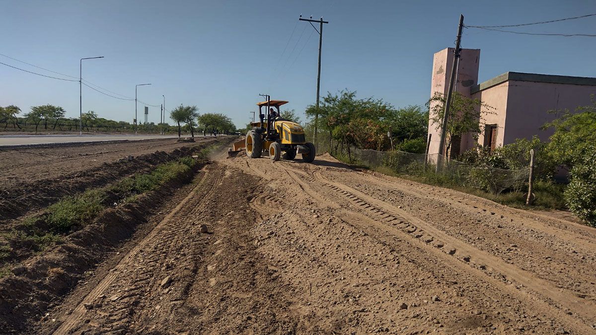 Empleados municipales de la comisión municipal de Colonia El Simbolar ejecutan tareas de distribución de piedra base estabilizada con canto rodado en calles del Barrio Ampliación Sector B, como parte del plan integral de mejoras viales que lleva adelante la comuna.