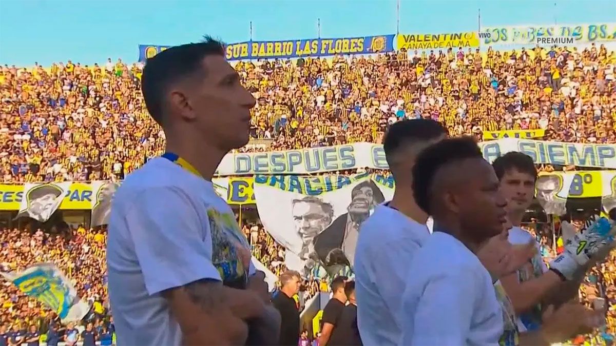 Tras el sorteo de capitanes, se proyectó un video con los mejores momentos de Miguel Russo en el club, que emocionó a todos los presentes. Entre los que no pudieron contener las lágrimas estuvieron jugadores como Ángel Di María y el Kily González, DT de Platense, que también mostró su profundo respeto por el legado del ídolo canalla.