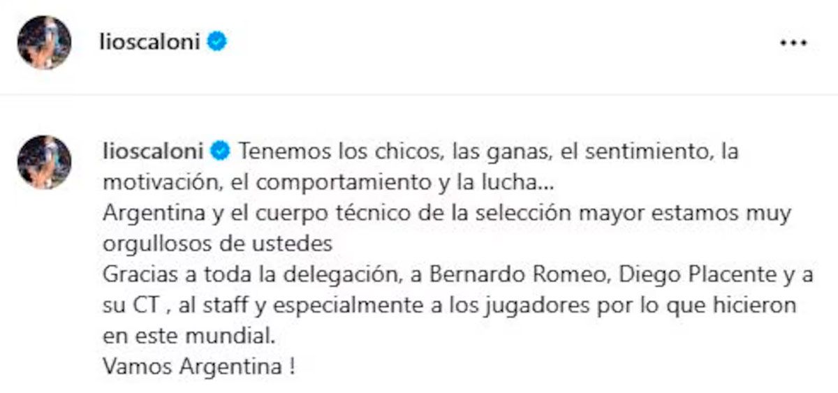 “Tenemos los chicos, las ganas, el sentimiento, la motivación, el comportamiento y la lucha. Argentina y el cuerpo técnico de la selección mayor estamos muy orgullosos de ustedes. Gracias a toda la delegación, a Bernardo Romeo, Diego Placente y a su CT, al staff y especialmente a los jugadores por lo que hicieron en este Mundial. Vamos Argentina”, escribió Scaloni en su cuenta de Instagram, junto a una foto del equipo juvenil.