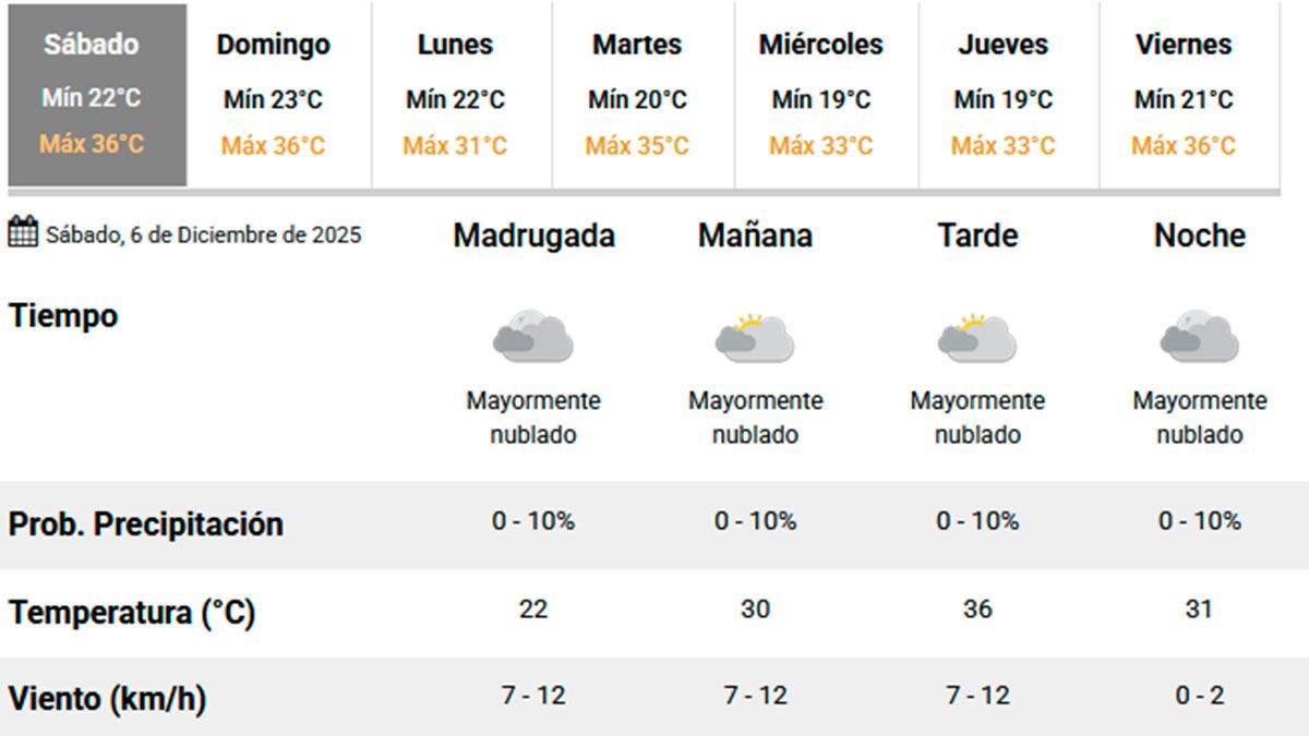Hacia la tarde, el termómetro trepará con fuerza hasta una máxima de 36°C, configurando un ambiente típico de diciembre en la provincia, con viento del sector noroeste que podría aportar una sensación térmica aún más elevada. La visibilidad se mantendrá óptima, alrededor de 10 kilómetros, y no se prevén lluvias para este sábado.