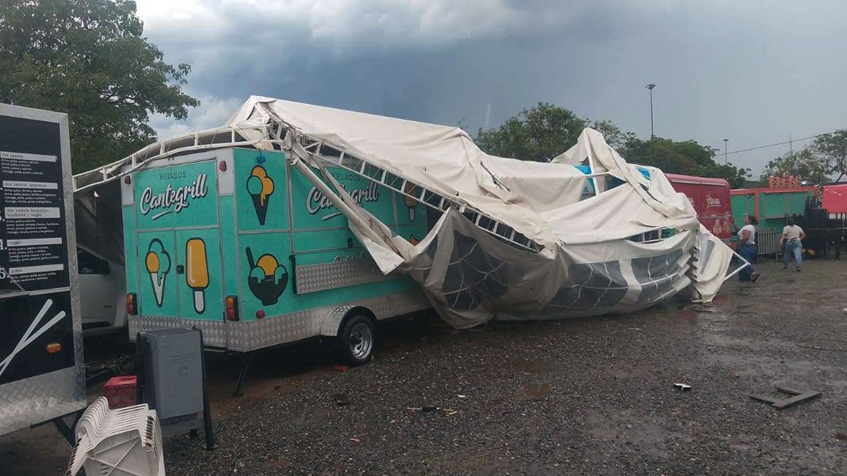 En las imágenes registradas tras la tormenta se pueden observar carpas colapsadas, elementos de los stands esparcidos por el predio y materiales dañados por el agua y el granizo.