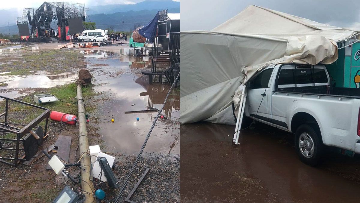 El temporal impactó de lleno en el lugar del evento y ocasionó la caída de carpas, importantes daños en puestos de feriantes y afectaciones en las estructuras montadas, incluido el escenario El Patio. Según relataron trabajadores y expositores, el viento levantó lonas, derribó estructuras de madera y generó momentos de tensión entre los presentes.