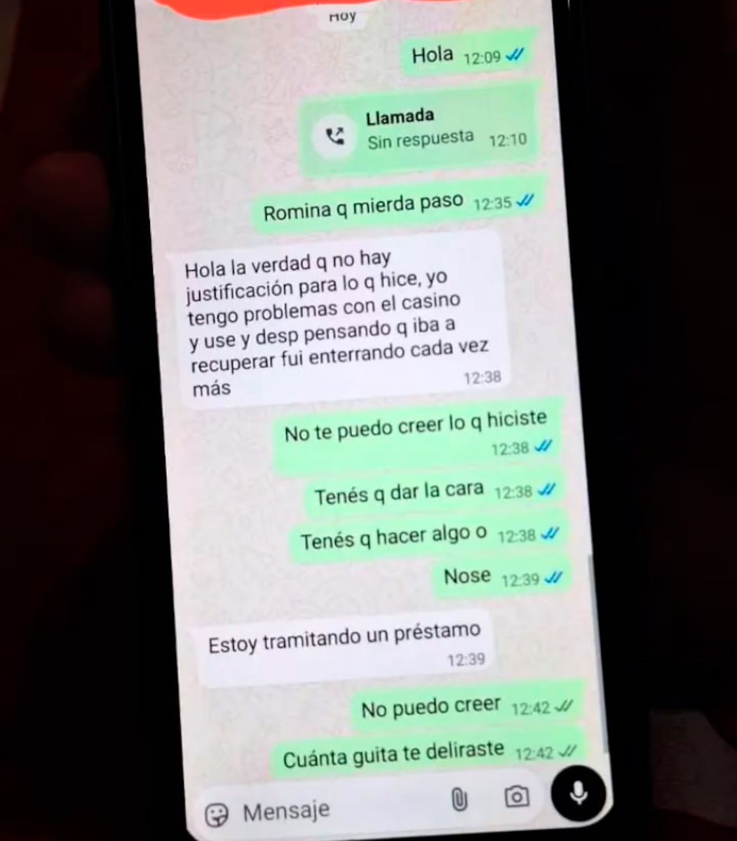 “No hay justificación para lo que hice. Tengo problemas con el casino. Usé la plata y pensando que la iba a recuperar, me fui enterrando cada vez más”, escribió.