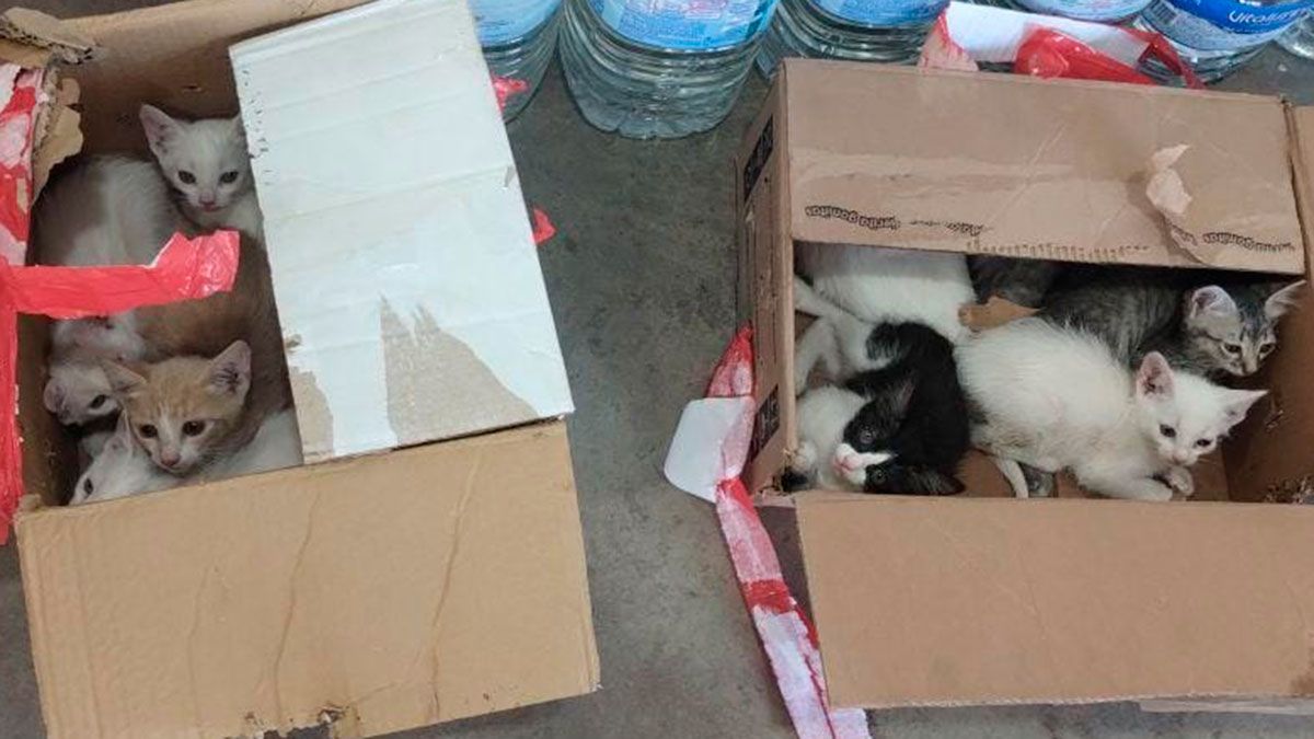 Trece gatitos fueron dejados a su suerte en la puerta de un local comercial, dentro de dos cajas, expuestos al frío, al hambre y a los peligros de la calle.