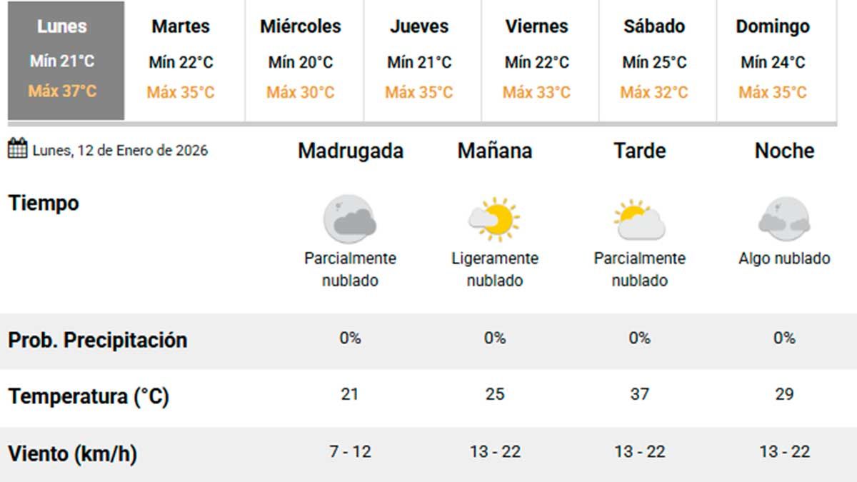 Según el Servicio Meteorológico Nacional (SMN), este lunes 12 de enero Santiago del Estero tendrá una jornada marcada por el calor intenso, con una temperatura máxima de 37°C y una mínima de 21°C.