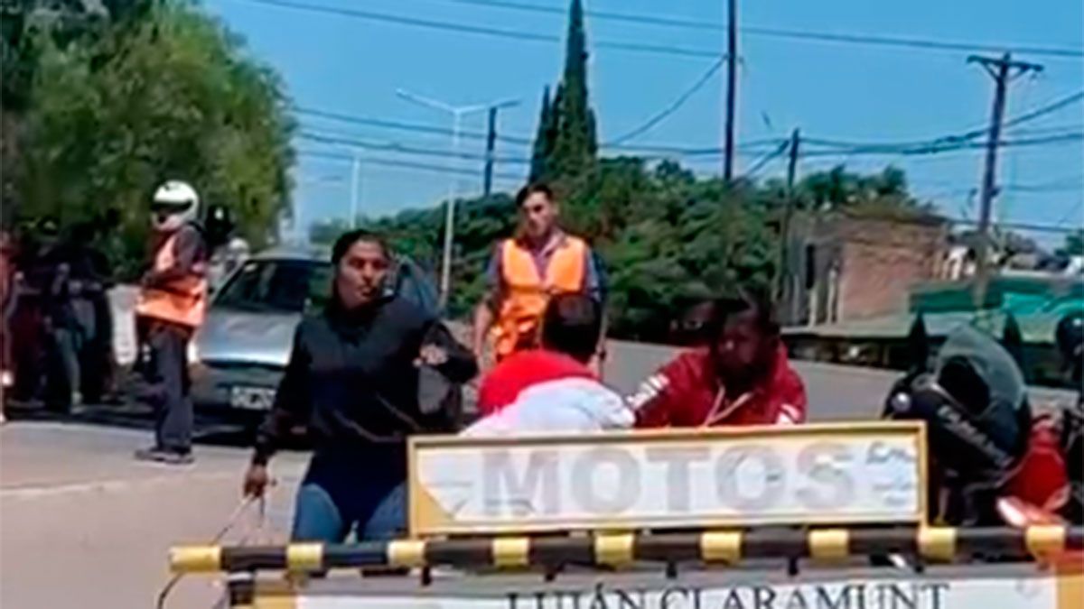 La pelea incluyó golpes de puño, patadas y hasta un rebenque por parte de una de las mujeres. En un momento, una de las involucradas cayó al suelo, golpeándose peligrosamente cerca de una estructura metálica utilizada como estacionamiento de motos.