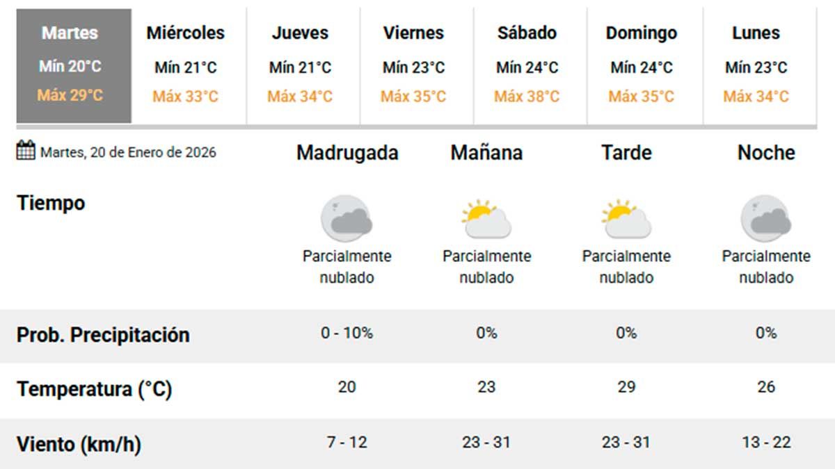 Según el Servicio Meteorológico Nacional, este martes 20 de enero se espera una jornada estable, con temperaturas moderadas y presencia de vientos intensos durante la mañana y la tarde.
