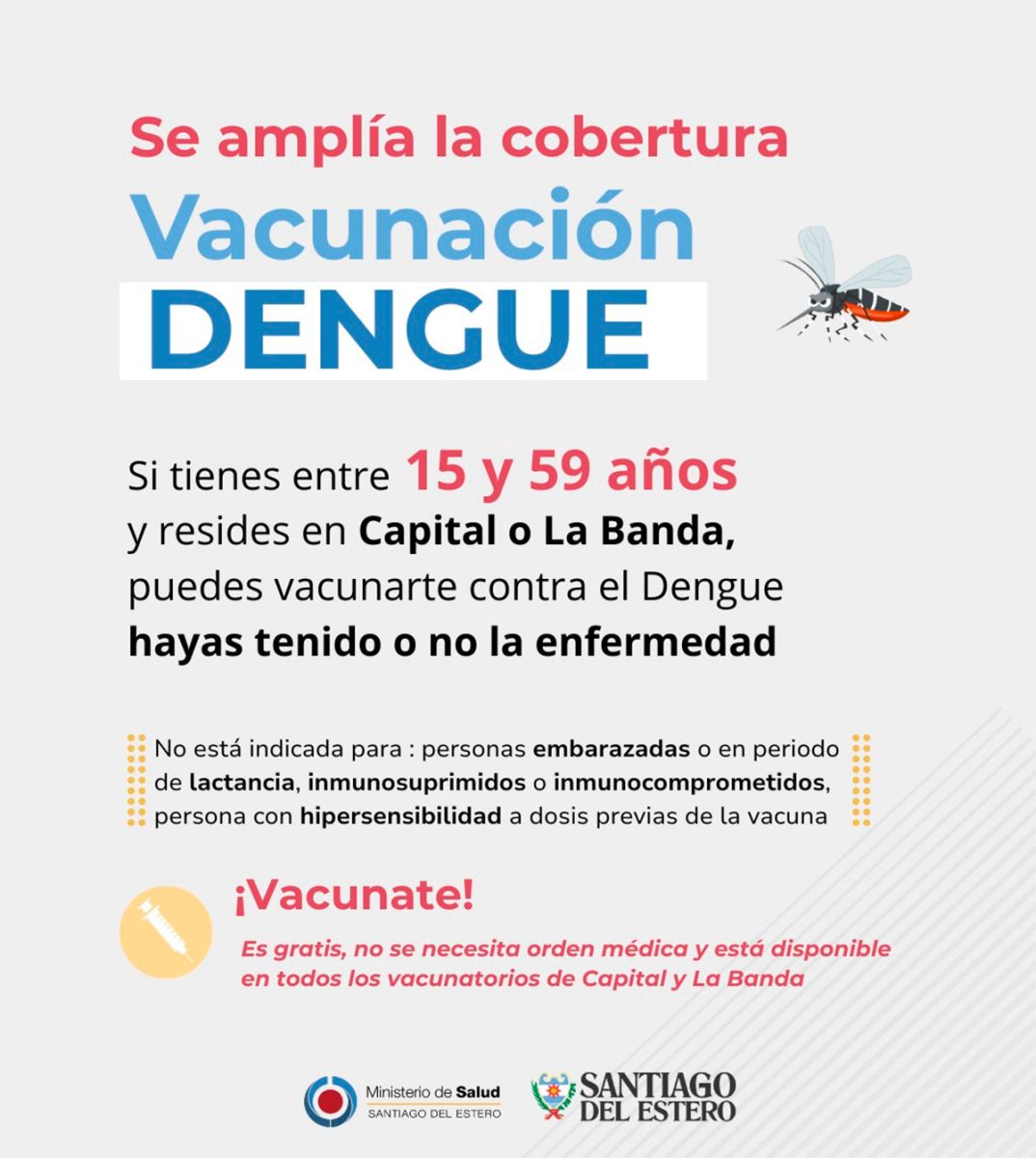 La vacunación está destinada a personas de 15 a 59 años, hayan tenido o no dengue, y se encuentra disponible en todos los vacunatorios de Capital y Banda. En el caso de quienes hayan cursado la enfermedad, deben esperar seis meses para iniciar la vacunación. No pueden vacunarse personas embarazadas, en período de lactancia, inmunosuprimidas o con antecedentes de reacciones alérgicas a dosis previas.