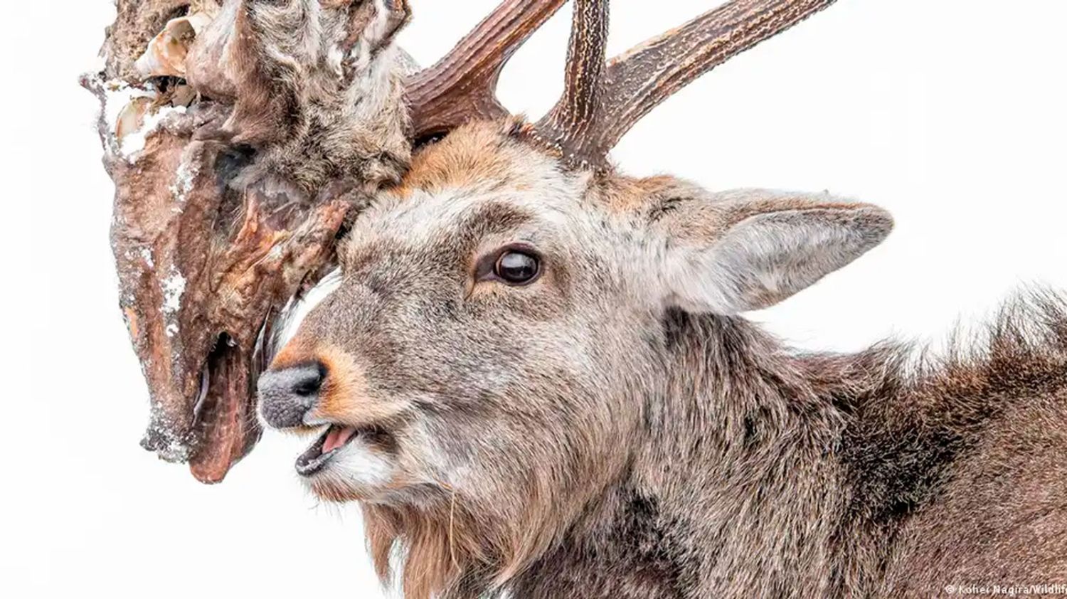 Entre las finalistas destaca precisamente la imagen del ciervo sika capturada por Kohei Nagira en Hokkaido, Japón. La fotografía muestra al animal tras un combate mortal durante la temporada de apareamiento: sus astas quedaron enganchadas a las del rival muerto y, según relató un pescador local citado en el comunicado oficial, el ciervo arrastró el cuerpo durante días hasta que solo quedó la cabeza.