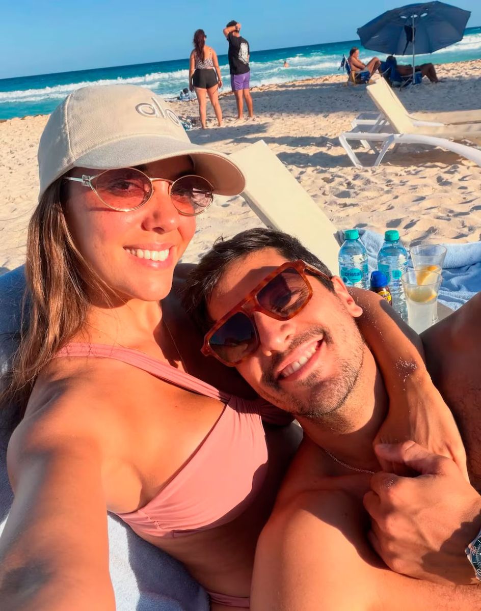 En otra postal, la pareja se tomó una selfie en la playa, abrazados y sonriendo, con el mar turquesa de fondo y las reposeras a su alrededor. El entorno natural acompaña cada momento, con aguas cristalinas y cielos despejados que invitan a disfrutar del sol y la tranquilidad.