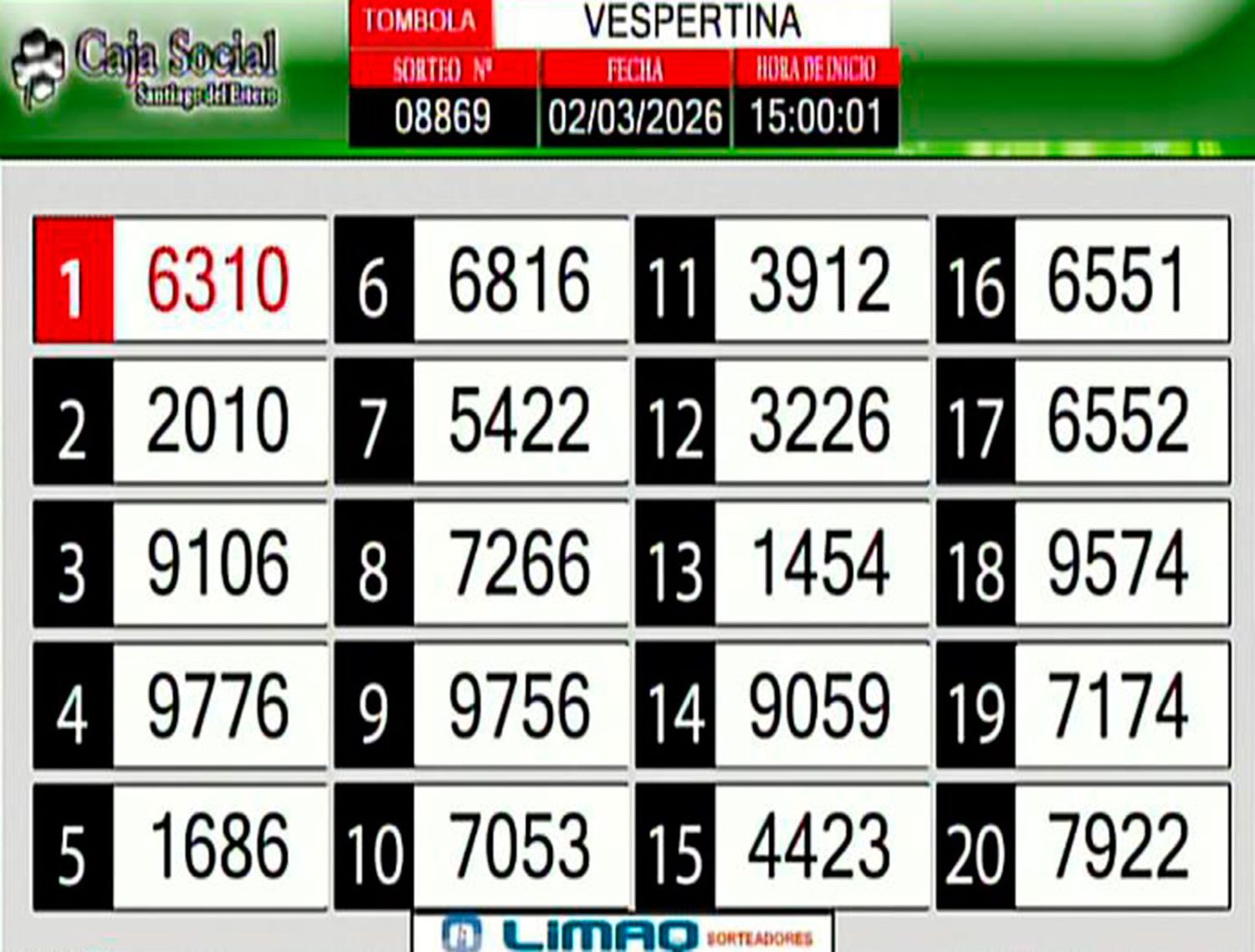 La lista completa de números del sorteo vespertino: