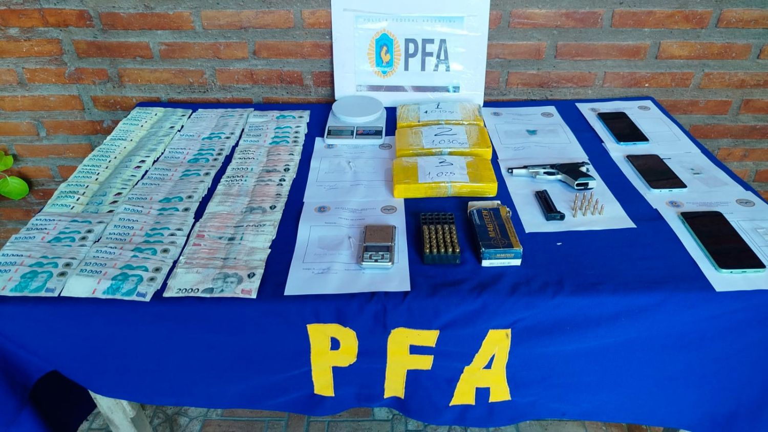 En el interior de la vivienda se secuestraron más de tres kilogramos de cocaína de máxima pureza, además de armas de fuego, una importante cantidad de dinero en efectivo y varios teléfonos celulares, elementos que serán sometidos a peritajes para profundizar la investigación.