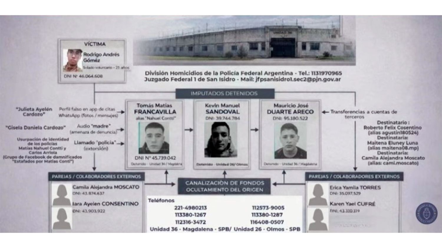"Vengo laburando hace una banda de tiempo... ya vengo hace dos años... una banda de presos está laburando así, en todos lados laburan así... en la 30 (Unidad de General Alvear) están laburando todos, en todos los pabellones están laburando". Este es uno de los mensajes de voz que la jueza federal de San Isidro Sandra Arroyo Salgado descubrió al investigar el suicidio del soldado Rodrigo Andrés Gómez (21). Rodrigo se mató la madrugada del 16 de diciembre de un disparo en la cabeza en su puesto de guardia en la Quinta Presidencial de Olivos.