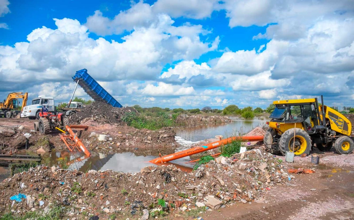 En esta oportunidad, se aportó material de relleno para realizar una nueva defensa que había sido alterada por el incremento del nivel del rio, para continuar con el trabajo de extracción de agua con dos bombas arroceras.