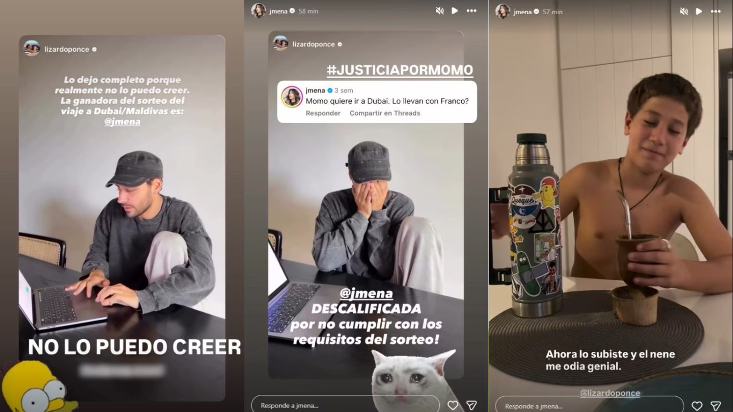 La historia tuvo un segundo capítulo en redes sociales cuando Jimena compartió la publicación de Lizardo en la que se comunicaba oficialmente la descalificación. En la imagen, Lizardo se cubre el rostro con las manos y el mensaje es contundente: “@jmena DESCALIFICADA por no cumplir con los requisitos del sorteo!”. Como respuesta, Jimena sumó el hashtag “#JUSTICIAPORMOMO” y rescató un comentario propio de semanas atrás: “Momo quiere ir a Dubái. ¿Lo llevan con Franco?”, aludiendo a su hijo y a la pareja de Lizardo.