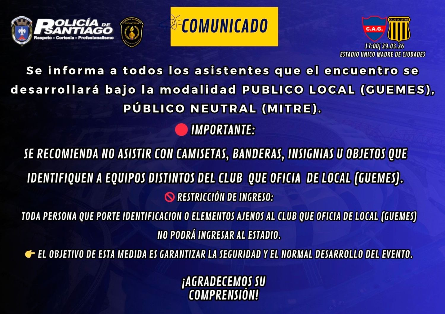 En la previa del clásico santiagueño entre Güemes y Mitre, a disputarse este domingo en el Estadio Único Madre de Ciudades, la Policía de la Provincia dio a conocer una serie de disposiciones destinadas a garantizar la seguridad del espectáculo.