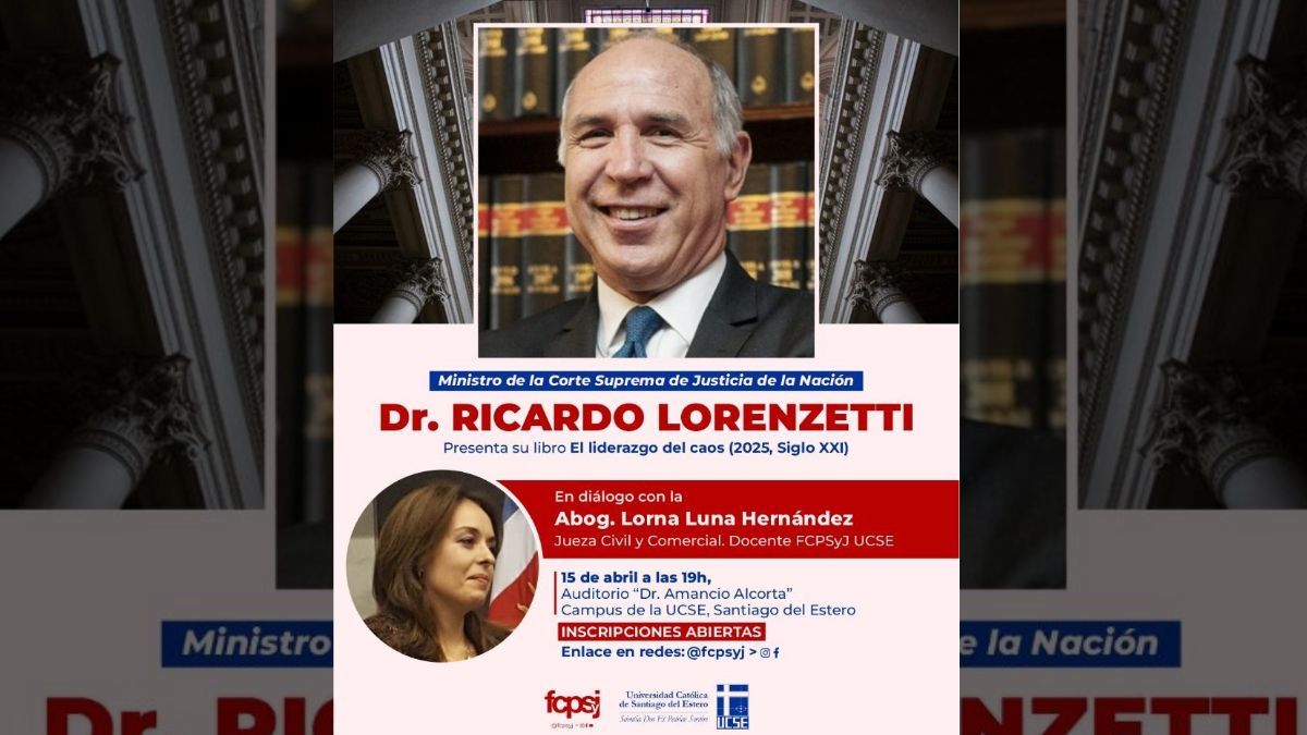 El ministro de la Corte Suprema de Justicia de la Nación, Ricardo Lorenzetti, visitará Santiago del Estero el próximo miércoles 15 de abril para presentar su más reciente obra, El liderazgo del caos (2025, Siglo XXI). La actividad se desarrollará desde las 19 en el Auditorio “Dr. Amancio Alcorta” de la Universidad Católica de Santiago del Estero, con entrada libre y gratuita.