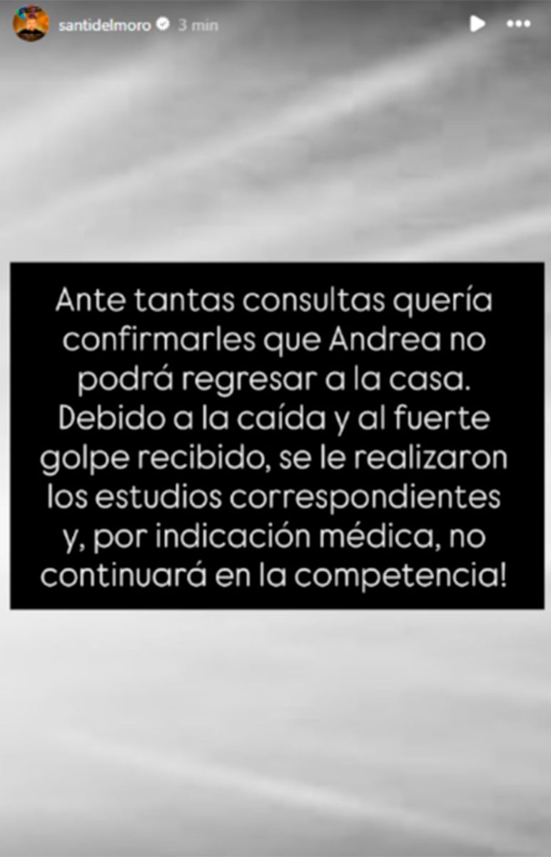 “Ante tantas consultas quería confirmarles que Andrea no podrá regresar a la casa. Debido a la caída y al fuerte golpe recibido, se le realizaron los estudios correspondientes y, por indicación médica, no continuará en la competencia”, comunicó el presentador a través de sus redes sociales.