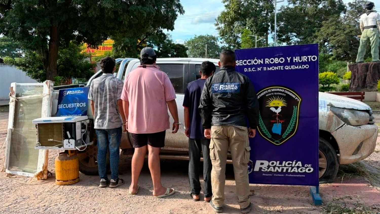 Con las pruebas reunidas, el Juzgado de Control y Garantías de la Circunscripción Monte Quemado ordenó allanamientos en cinco inmuebles ubicados en los barrios Belgrano, Triángulo, Villa Nueva, San Cayetano y en el paraje rural Las Torrez, del departamento Copo, desde donde se secuestraron varios elementos relacionados con el hecho, entre ellos una garrafa de 10 kilogramos, un aire acondicionado marca Electra con su control remoto, un ventanal de aluminio y una camioneta Toyota Hilux de color blanco.